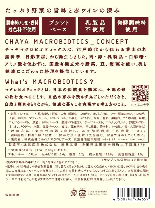 私たちチャヤ マクロビオティックスは、江戸時代から伝わる葉山の老舗料亭「日影茶屋」から誕生しました。国産有機玄米にこだわり、有機・特別栽培の野菜や、豆、海藻を使った料理を提供しています。肉・卵・乳製品・白砂糖・化学調味料を使わずにつくった、体にやさしく、見た目に楽しい料理をお届けします。 チャヤ マクロビオティックスのオンラインショップでは、チャヤ マクロビの商品をはじめとした、肉・卵・乳製品・白砂糖・化学調味料を使わずにつくった商品をお取り扱いしています。本商品は、チャヤマクロビ各店(新宿店・日比谷店・汐留店)、CHAYAカフェOrganic coffee&Bread、Vegan Friendly Tokyo、一部百貨店・グロサリーストア・ショップ等で取扱いただいております。 ※商品の在庫・取り扱い状況におきましては、店舗によって異なります。また、一部限定販売もございます。ご了承のほどお願い申し上げます。