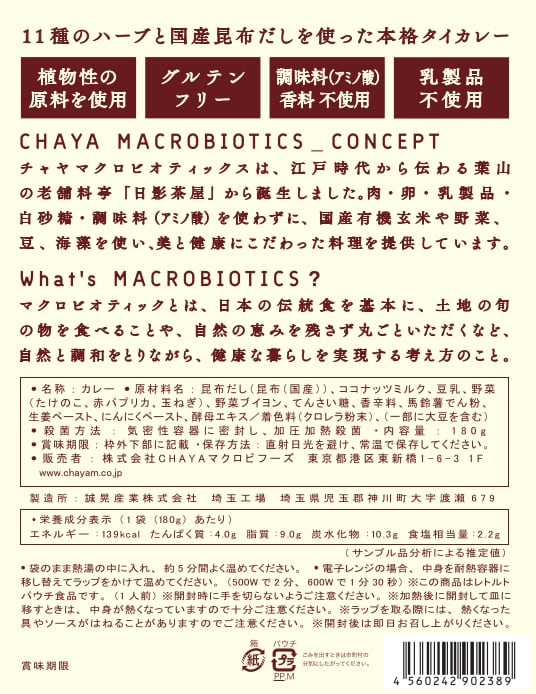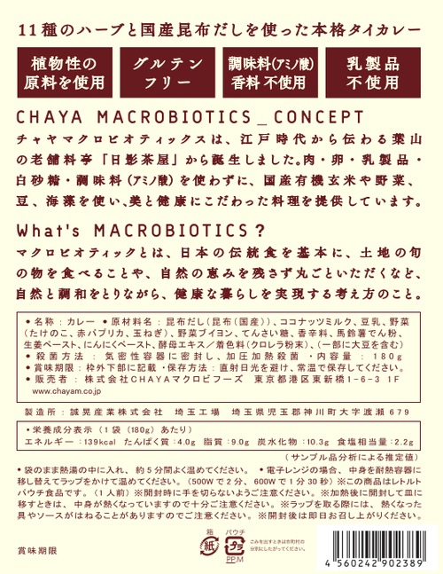 私たちチャヤ マクロビオティックスは、江戸時代から伝わる葉山の老舗料亭「日影茶屋」から誕生しました。国産有機玄米にこだわり、有機・特別栽培の野菜や、豆、海藻を使った料理を提供しています。肉・卵・乳製品・白砂糖・化学調味料を使わずにつくった、体にやさしく、見た目に楽しい料理をお届けします。 チャヤ マクロビオティックスのオンラインショップでは、チャヤ マクロビの商品をはじめとした、肉・卵・乳製品・白砂糖・化学調味料を使わずにつくった商品をお取り扱いしています。本商品は、チャヤマクロビ各店(新宿店・日比谷店・汐留店)、CHAYAカフェOrganic coffee&Bread、Vegan Friendly Tokyo、一部百貨店・グロサリーストア・ショップ等で取扱いただいております。 ※商品の在庫・取り扱い状況におきましては、店舗によって異なります。また、一部限定販売もございます。ご了承のほどお願い申し上げます。