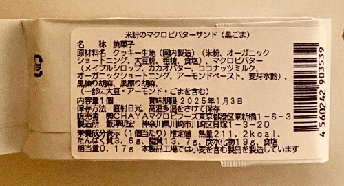 ○原材料:クッキー生地(国内製造)(米粉、オーガニックショートニング、大豆粉、粗糖、食塩)、マクロビバター(メイプルシロップ、カカオバター、ココナッツミルク、オーガニックショートニング、アーモンドペースト、麦芽水飴)、黒練り胡麻、黒磨り胡麻、、(一部に大豆・アーモンド・ごまを含む)