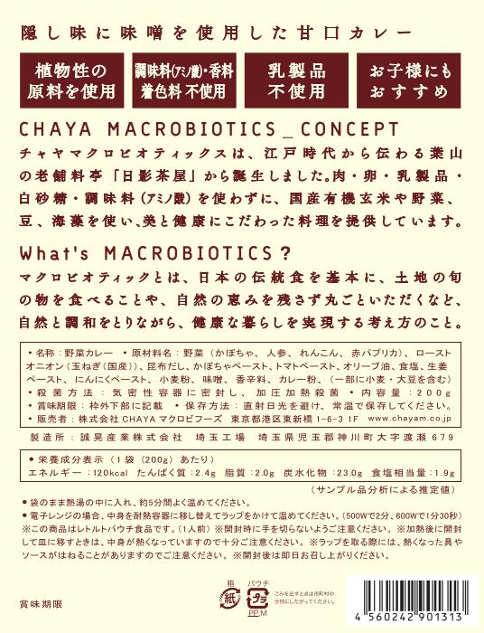 私たちチャヤ マクロビオティックスは、江戸時代から伝わる葉山の老舗料亭「日影茶屋」から誕生しました。国産有機玄米にこだわり、有機・特別栽培の野菜や、豆、海藻を使った料理を提供しています。肉・卵・乳製品・白砂糖・化学調味料を使わずにつくった、体にやさしく、見た目に楽しい料理をお届けします。 チャヤ マクロビオティックスのオンラインショップでは、チャヤ マクロビの商品をはじめとした、肉・卵・乳製品・白砂糖・化学調味料を使わずにつくった商品をお取り扱いしています。本商品は、チャヤマクロビ各店(新宿店・日比谷店・汐留店)、CHAYAカフェOrganic coffee&Bread、Vegan Friendly Tokyo、一部百貨店・グロサリーストア・ショップ等で取扱いただいております。 ※商品の在庫・取り扱い状況におきましては、店舗によって異なります。また、一部限定販売もございます。ご了承のほどお願い申し上げます。
