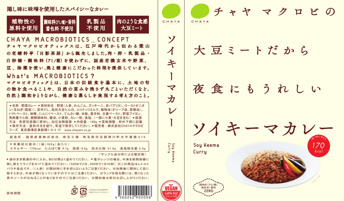 私たちチャヤ マクロビオティックスは、江戸時代から伝わる葉山の老舗料亭「日影茶屋」から誕生しました。国産有機玄米にこだわり、有機・特別栽培の野菜や、豆、海藻を使った料理を提供しています。肉・卵・乳製品・白砂糖・化学調味料を使わずにつくった、体にやさしく、見た目に楽しい料理をお届けします。 チャヤ マクロビオティックスのオンラインショップでは、チャヤ マクロビの商品をはじめとした、肉・卵・乳製品・白砂糖・化学調味料を使わずにつくった商品をお取り扱いしています。本商品は、チャヤマクロビ各店(新宿店・日比谷店・汐留店)、CHAYAカフェOrganic coffee&Bread、Vegan Friendly Tokyo、一部百貨店・グロサリーストア・ショップ等で取扱いただいております。 ※商品の在庫・取り扱い状況におきましては、店舗によって異なります。また、一部限定販売もございます。ご了承のほどお願い申し上げます。
