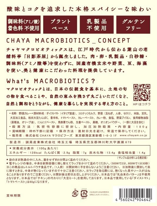 私たちチャヤ マクロビオティックスは、江戸時代から伝わる葉山の老舗料亭「日影茶屋」から誕生しました。国産有機玄米にこだわり、有機・特別栽培の野菜や、豆、海藻を使った料理を提供しています。肉・卵・乳製品・白砂糖・化学調味料を使わずにつくった、体にやさしく、見た目に楽しい料理をお届けします。 チャヤ マクロビオティックスのオンラインショップでは、チャヤ マクロビの商品をはじめとした、肉・卵・乳製品・白砂糖・化学調味料を使わずにつくった商品をお取り扱いしています。本商品は、チャヤマクロビ各店(新宿店・日比谷店・汐留店)、CHAYAカフェOrganic coffee&Bread、Vegan Friendly Tokyo、一部百貨店・グロサリーストア・ショップ等で取扱いただいております。 ※商品の在庫・取り扱い状況におきましては、店舗によって異なります。また、一部限定販売もございます。ご了承のほどお願い申し上げます。