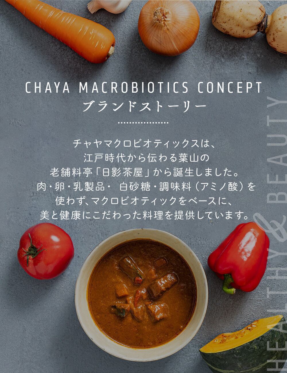 私たちチャヤ マクロビオティックスは、江戸時代から伝わる葉山の老舗料亭「日影茶屋」から誕生しました。国産有機玄米にこだわり、有機・特別栽培の野菜や、豆、海藻を使った料理を提供しています。肉・卵・乳製品・白砂糖・化学調味料を使わずにつくった、体にやさしく、見た目に楽しい料理をお届けします。 チャヤ マクロビオティックスのオンラインショップでは、チャヤ マクロビの商品をはじめとした、肉・卵・乳製品・白砂糖・化学調味料を使わずにつくった商品をお取り扱いしています。本商品は、チャヤマクロビ各店(新宿店・日比谷店・汐留店)、CHAYAカフェOrganic coffee&Bread、Vegan Friendly Tokyo、一部百貨店・グロサリーストア・ショップ等で取扱いただいております。 ※商品の在庫・取り扱い状況におきましては、店舗によって異なります。また、一部限定販売もございます。ご了承のほどお願い申し上げます。