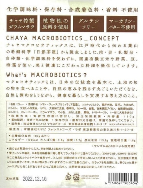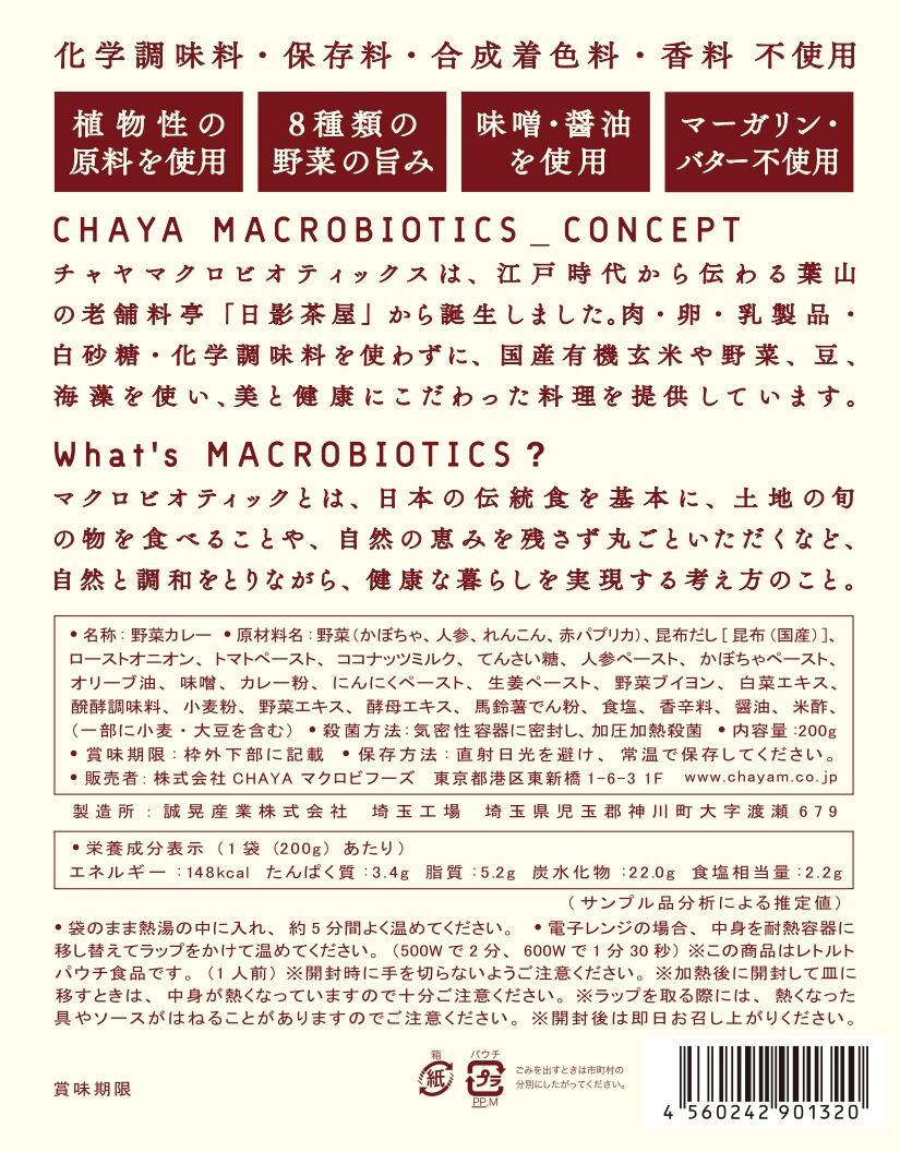 私たちチャヤ マクロビオティックスは、江戸時代から伝わる葉山の老舗料亭「日影茶屋」から誕生しました。国産有機玄米にこだわり、有機・特別栽培の野菜や、豆、海藻を使った料理を提供しています。肉・卵・乳製品・白砂糖・化学調味料を使わずにつくった、体にやさしく、見た目に楽しい料理をお届けします。 チャヤ マクロビオティックスのオンラインショップでは、チャヤ マクロビの商品をはじめとした、肉・卵・乳製品・白砂糖・化学調味料を使わずにつくった商品をお取り扱いしています。本商品は、チャヤマクロビ各店(新宿店・日比谷店・汐留店)、CHAYAカフェOrganic coffee&Bread、Vegan Friendly Tokyo、一部百貨店・グロサリーストア・ショップ等で取扱いただいております。 ※商品の在庫・取り扱い状況におきましては、店舗によって異なります。また、一部限定販売もございます。ご了承のほどお願い申し上げます。
