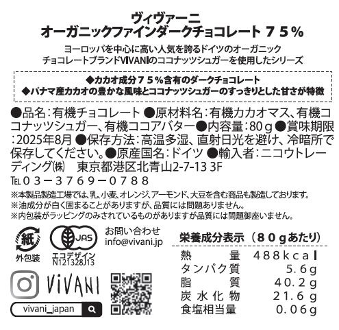 ViVANIは100年以上の長い歴史を誇るドイツのチョコレートメーカーです。創業以来培われてきた高い製造技術をもって作られた程よい甘さとなめらかな口触りが特徴のチョコレートは多くの支持を得てきました。厳選された原料を使用するオーガニックチョコレートのパイオニアとしてもヨーロッパを中心に多くのファンに愛されています。