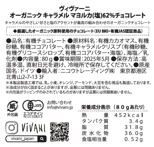 ○原材料名:有機カカオマス、有機砂糖、有機ココアバター、有機キャラメルクリスプ(有機砂糖、有機グリコースシロップ、有機ココアバター・海塩)、海塩/乳化剤