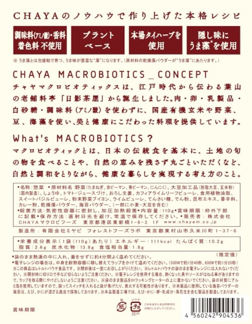 私たちチャヤ マクロビオティックスは、江戸時代から伝わる葉山の老舗料亭「日影茶屋」から誕生しました。国産有機玄米にこだわり、有機・特別栽培の野菜や、豆、海藻を使った料理を提供しています。肉・卵・乳製品・白砂糖・化学調味料を使わずにつくった、体にやさしく、見た目に楽しい料理をお届けします。 チャヤ マクロビオティックスのオンラインショップでは、チャヤ マクロビの商品をはじめとした、肉・卵・乳製品・白砂糖・化学調味料を使わずにつくった商品をお取り扱いしています。本商品は、チャヤマクロビ各店(新宿店・日比谷店・汐留店)、CHAYAカフェOrganic coffee&Bread、Vegan Friendly Tokyo、一部百貨店・グロサリーストア・ショップ等で取扱いただいております。 ※商品の在庫・取り扱い状況におきましては、店舗によって異なります。また、一部限定販売もございます。ご了承のほどお願い申し上げます。